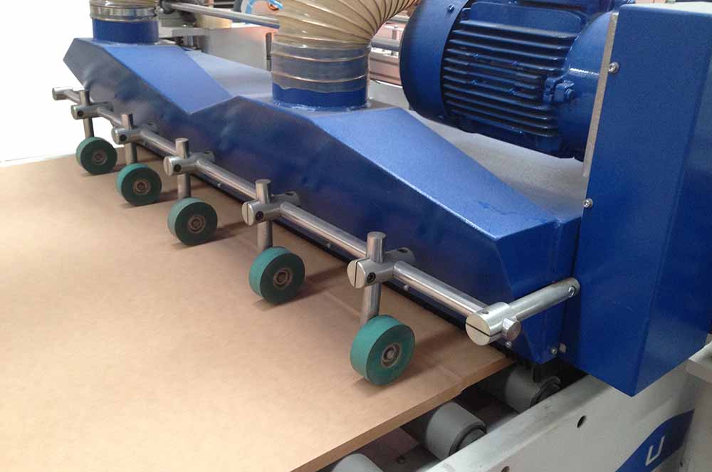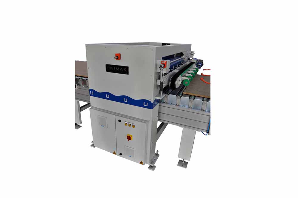 Brushing system with adjustable height provides cleaning for panel surfaces. First rough cleaning with hair bristled brush then micron grade cleaning with blower supplied vacuum system and wet brush which works vertical direction of material flow provides cleaning.Unit consists of 6 pieces of 6”-Ø152mm dust suction pipe.In addition provides cleaning for left and right sides of panel with side brushes.