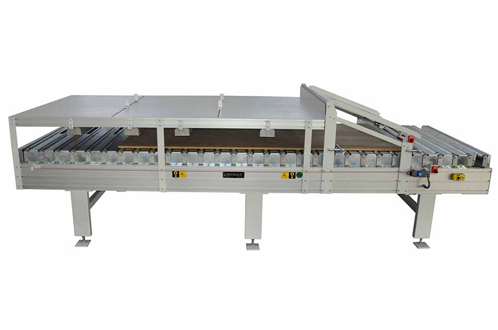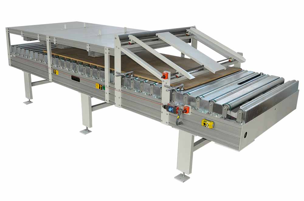 4.5m long conveyor desinged for sheet feeding. Adjustable profile guide system ensures panel passage for various width. It also contains acrylic sheet wrapping station (SF130).