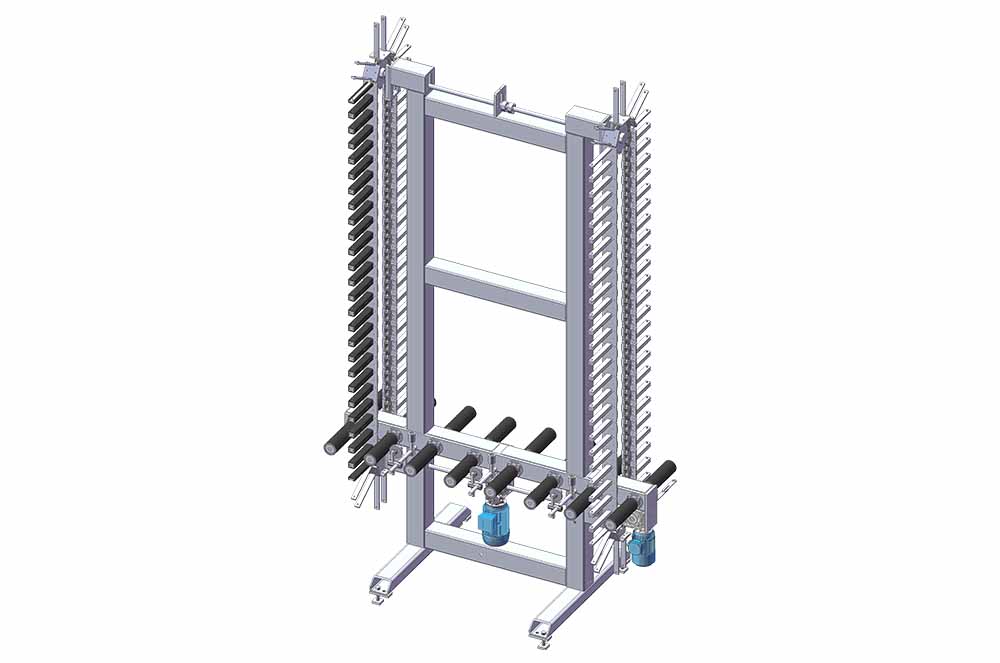 Lift, located at the end of L-casing machine, provides rotating and cooling for glue applied casing before milling.