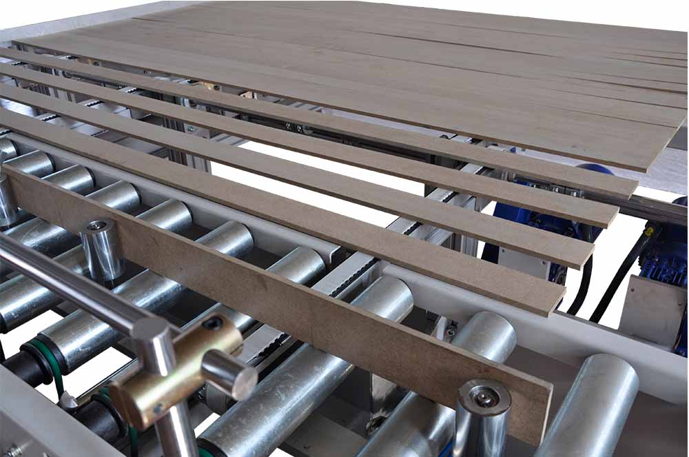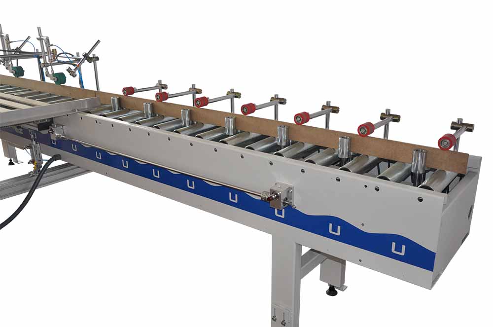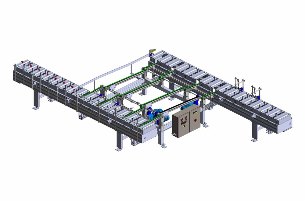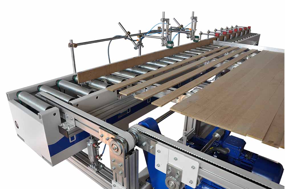 Automatic profile infeed and outfeed system to increase the efficiency of high speed production lines. It has the capacity of working 60m/min line speed.