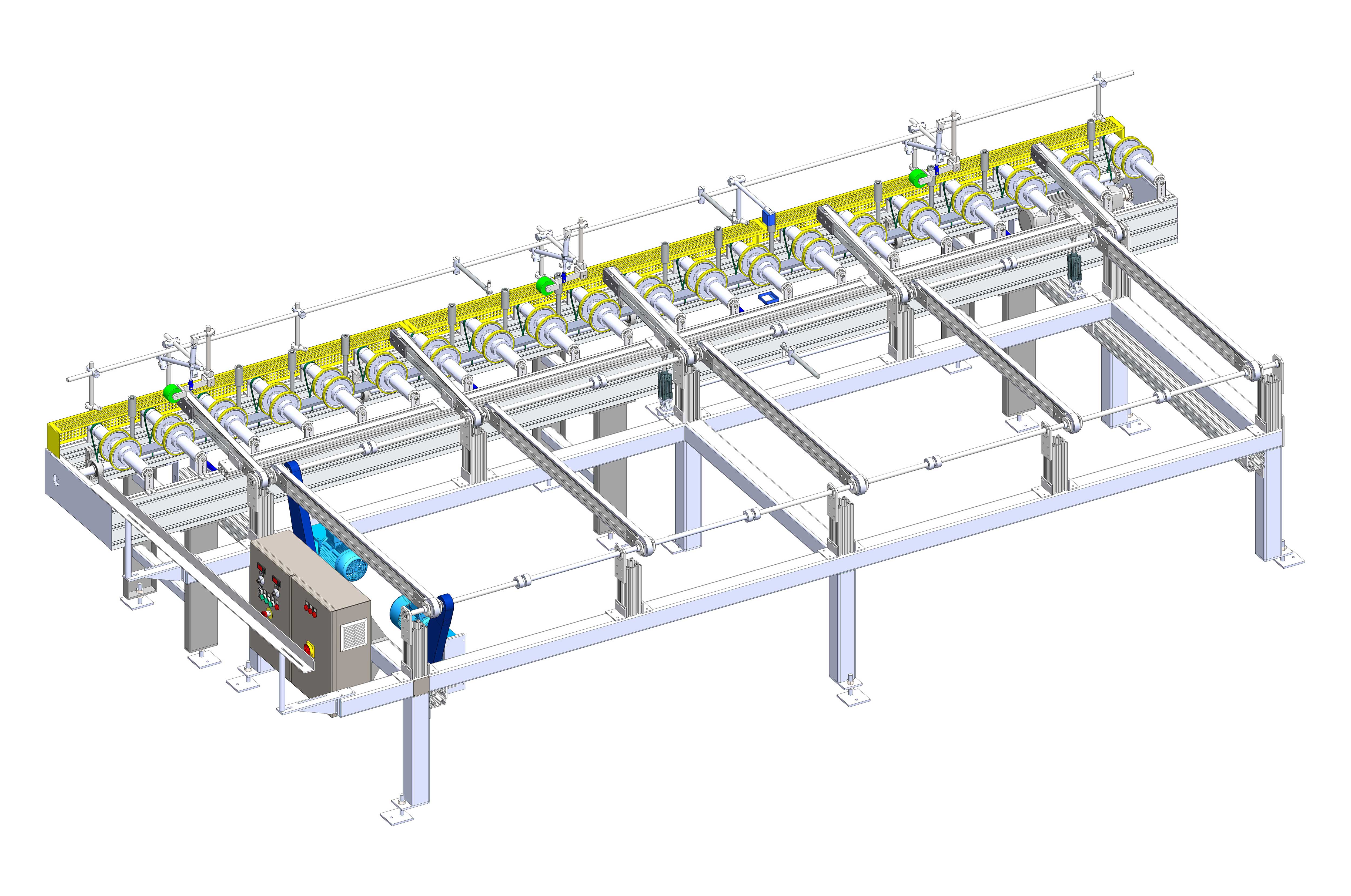 Automatic profile feeding system to increase the efficiency of high speed production lines. It has the capacity of working 60m/min line speed.