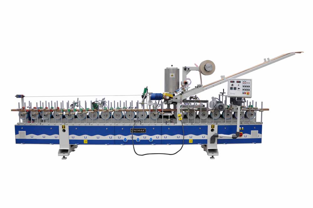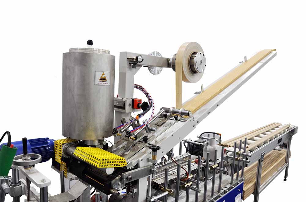 Profile wrapping machine with Ethylene Vinyl Acetate (EVA/PO) glue applying roller; wraps natural veneer, finish foil, CPL (micro laminate) and P.P. (roll or papel) foils to MDF, wooden profiles, wall panels, frame and casing.