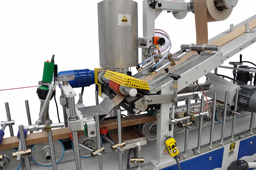 Profile wrapping machine with Ethylene Vinyl Acetate (EVA/PO) glue applying roller; wraps natural veneer, finish foil, CPL (micro laminate) and P.P. (roll or papel) foils to MDF, wooden profiles, wall panels, frame and casing.