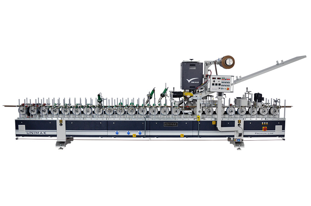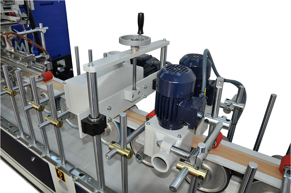 Profile wrapping machine wraps natural veneer, finish foil, P.P., PVC and CPL (micro laminate) foils (roll or papel) to MDF, wooden profile, wall panels, frame and casing with Polyurethane (PUR) and EVA / PO Hotmelt System (VMM) and glue applying roller.