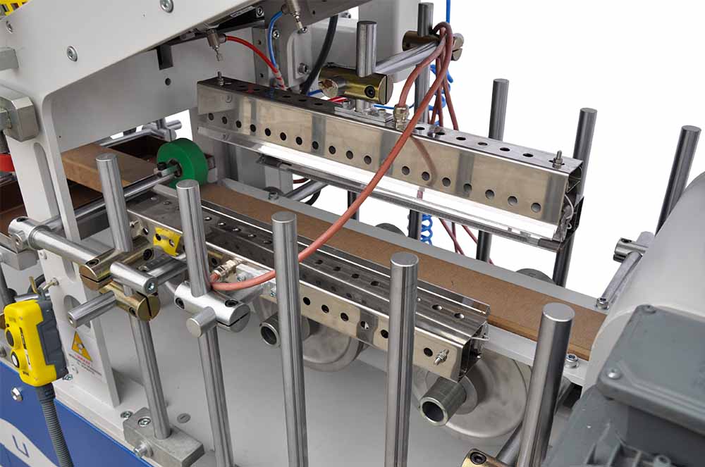 Profile wrapping machine wraps natural veneer, finish foil, P.P., PVC and CPL (micro laminate) foils (roll or papel) to MDF, wooden profile, wall panels, frame and casing with Polyurethane (PUR) and EVA / PO Hotmelt System (VMM) and glue applying roller.