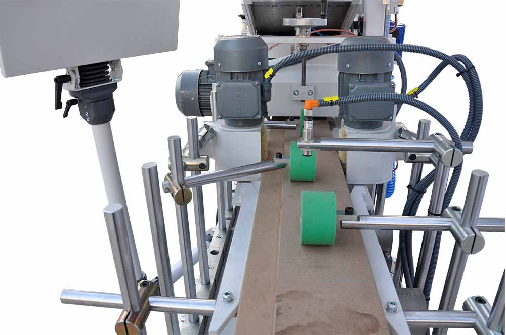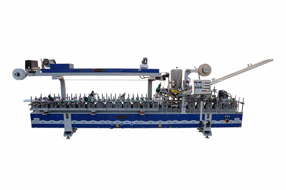 Profile wrapping machine wraps natural veneer, finish foil, P.P., PVC, CPL (micro laminate) foils (roll or papel) to wooden and MDF profiles, wall panels, frame and casing with EVA / PO Hotmelt and double component Solvent (PU) glue system on single body.